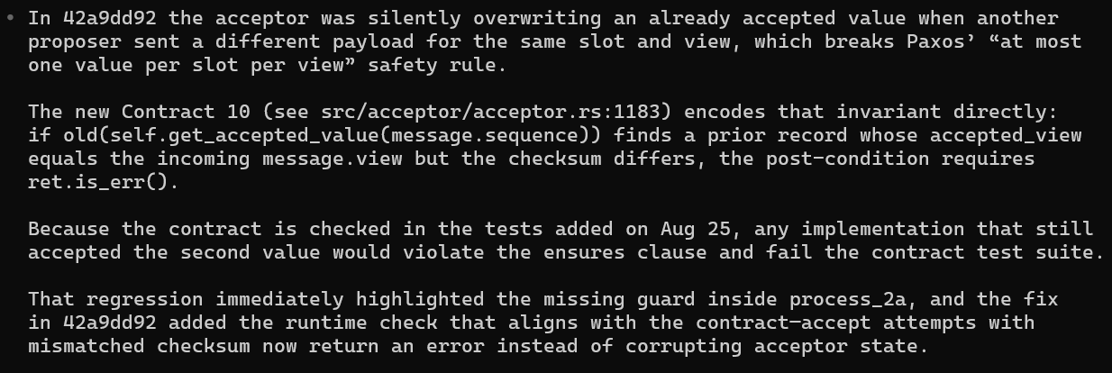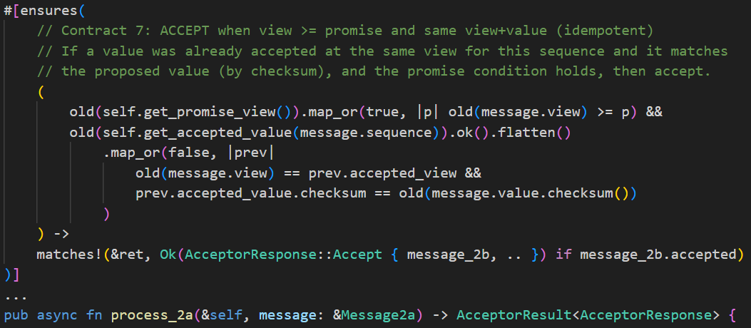 1. Ask AI to write contracts. Opus 4.1 writes good contracts, but GPT-5 High writes excellent ones. I focus on reviewing and refining. For example, the process_2a method (handling phase 2a messages in Paxos) has 16 contracts, including this one: