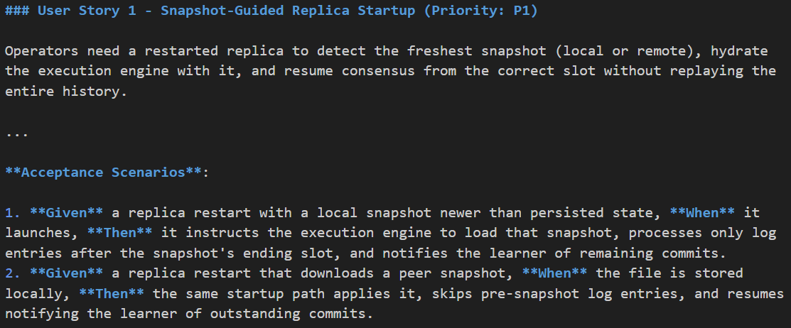 I’ve now switched to a more lightweight approach. When I work on a feature (e.g., snapshotting), I use /specify from spec kit [3] to generate a spec markdown. This spec consists of a few user stories and acceptance criteria.